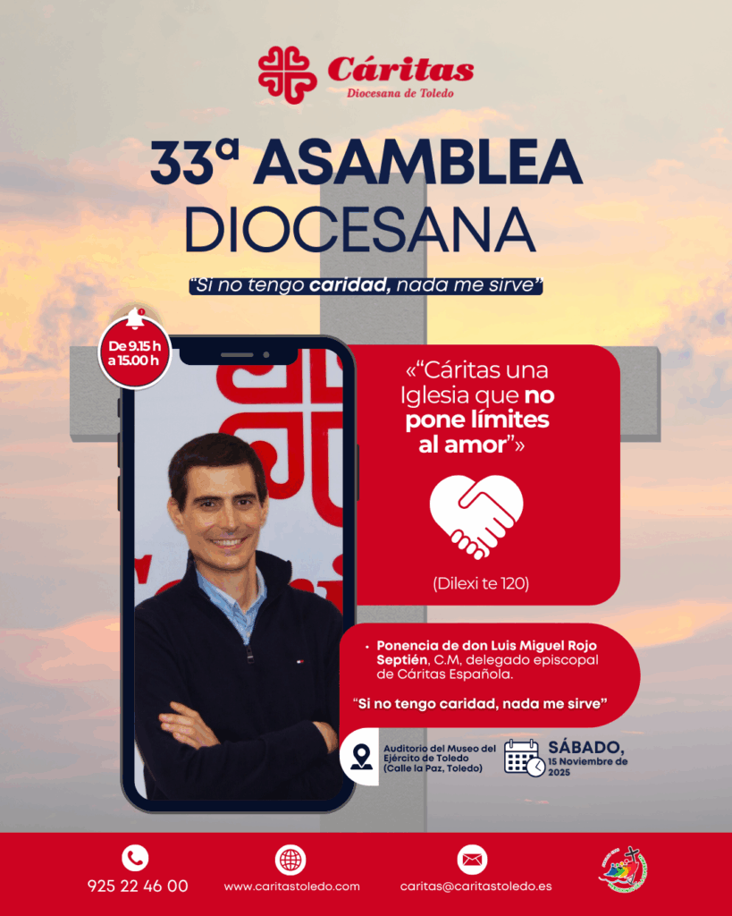 Este mes de noviembre se cumplen cuatro años desde que Cáritas Diocesana de Toledo celebrara en el Auditorio del Museo del Ejército la Asamblea Diocesana en la que se nombró al actual director, José Luis González, a la secretaria general, Mónica Moreno, y al administrador de Cáritas Diocesana de Toledo, Ramón Martín. Por este motivo Cáritas Diocesana de Toledo celebrará el sábado 15 de noviembre, la 33ª Asamblea Diocesana que tendrá lugar en el Auditorio del Museo del Ejército, en horario de 10.00 h a 15.00 horas.