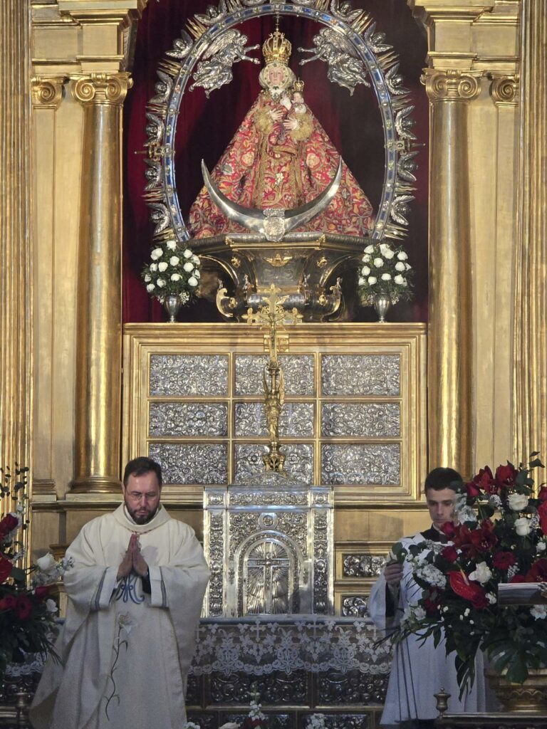 Don Salvador obsequiaba a la Patrona de Illescas con un rosario del Papa León XIV, haciendo entrega del mismo a las Camareras de la Virgen. Durante su homilía enlazaba el encuentro de Moisés con la zarza ardiente en el Monte Horeb y el encuentro de la joven tullida con la Virgen de la Caridad, en cuyas manos tiene a Cristo, “Horno ardiente de Caridad”.