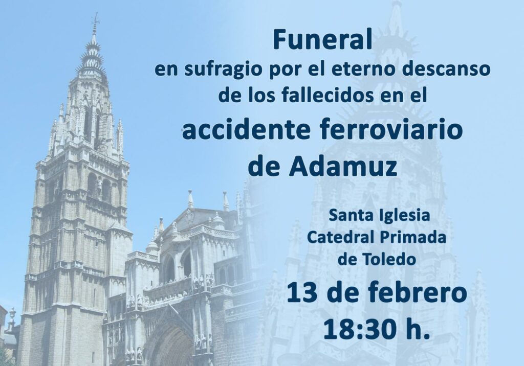 La Catedral Primada acoge este próximo viernes, 13 de febrero, una misa de funeral por los fallecidos en el accidente ferroviario del pasado 18 de enero, sucedido en la localidad cordobesa de Adamuz. Será a las 6,30 de la tarde y estará presidido por el arzobispo de Toledo, Mons. Francisco Cerro Chaves; igualmente concelebrará el obispo auxiliar y secretario general de la Conferencia Episcopal, Mons. Francisco César García Magán.