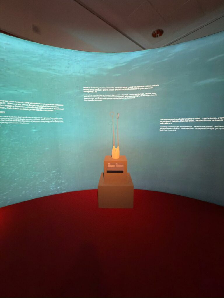 En la mitad del recorrido se ofrece un audiovisual mapping construido pedagógica y catequéticamente sobre el célebre “sarcófago dogmático” (año 340) conservado en los Museos Vaticanos. Se trata de una réplica que ha permitido de este modo que esta obra maestra salga por primera vez de Roma. El relieve de este sarcófago expresa la fe en la resurrección de aquellos esposos del siglo IV que allí fueron sepultados, y lo hace además poniendo en evidencia que Cristo es de la misma naturaleza que el Padre.