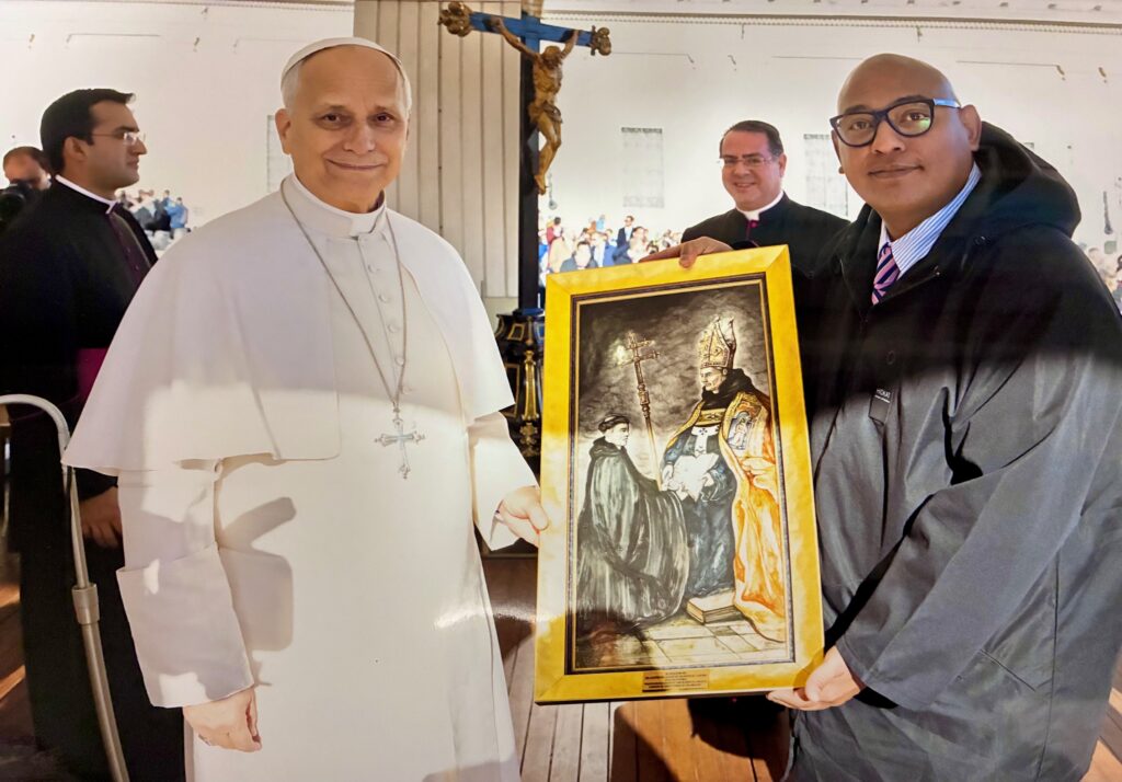 Otro de los obsequios entregado a León XIV fue un cuadro realizado en cerámica talaverana. La pieza artística representa la escena de la toma de votos de san Alonso de Orozco ante santo Tomás de Villanueva, ambos agustinos; una iconografía cargada de significado para la tradición espiritual española y para la identidad cultural de Talavera de la Reina.