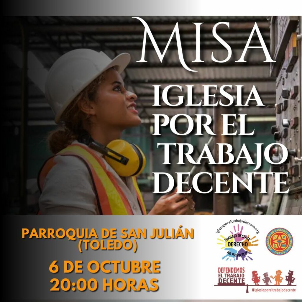 Un año más, la delegación diocesana de Pastoral del Trabajo se suma, impulsa y convoca a toda la Archidiócesis a participar en la celebración de la Misa por el Trabajo Decente, que tendrá lugar el próximo 6 de octubre, a las 20:00 horas, en la Parroquia de San Julián, de la ciudad de Toledo.