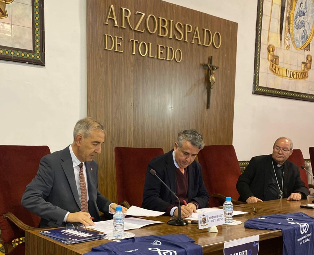 El director de Cáritas Diocesana de Toledo, José Luis González Montañés, y el ecónomo diocesano, Anastasio Gómez Hidalgo, han formalizado, un año más, el acuerdo de colaboración por el cual la Pulsera Turística de Toledo se consolida como patrocinador principal de la XI Fiesta por la Mujer y la Vida. Esta alianza se materializa en una aportación de 5.500 € destinada íntegramente a Proyecto Mater, el programa del arzobispado que acompaña a mujeres en riesgo de aborto y postaborto.